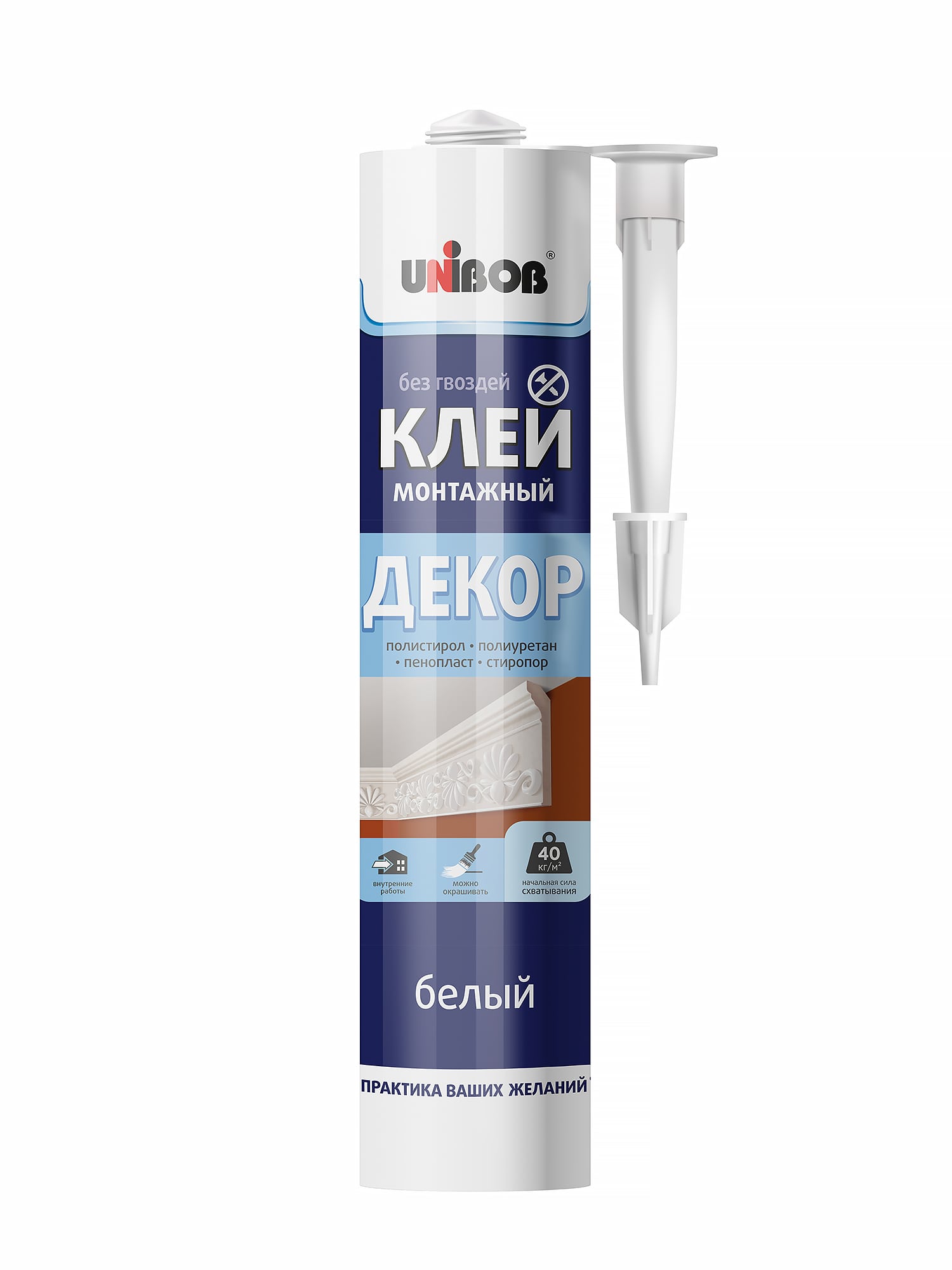 Универсальный влагостойкий монтажный клей для приклеивания различных материалов и декоративных элементов. Идеально подходит для монтажа легких изделий из стиропора, полистирола, ПВХ, пластика, ДСП, гипсокартона, пробки в том числе плинтусов, потолочных и декоративных фризов, деревянных элементов. Удобен в работе на вертикальных поверхностях. Подходит для работ как внутри помещения, так и снаружи зданий под навесом. Избегать попадания влаги во время нанесения.